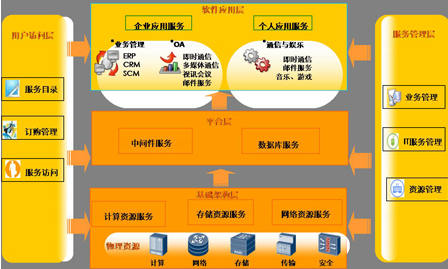 1、要求企业的IT基础设施能够根据业务应用系统的需要而变化。 2、要求IT基础设施的管理与使用能够跟得上业务和应用的变化。 企业云计算服务平台解决方案总体架构如下图一,该架构由5个主要部分构成,包括:软件应用层、平台层、基础架构层、用户访问层、服务管理层。云计算的本质是通过网络提供服务,所以其架构以服务为核心。软件应用层、平台层、基础架构层是云计算提供的不同层次的服务。
